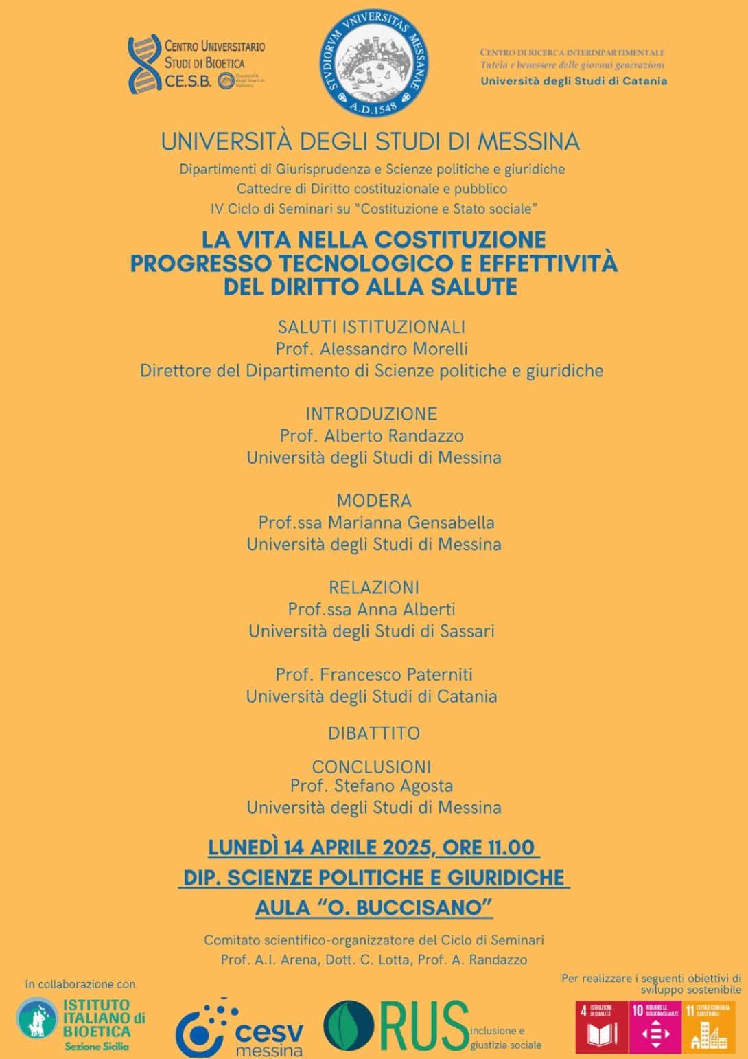 Dopo i saluti istituzionali del Direttore del Dipartimento, Prof. Alessandro Morelli, l’incontro sarà animato dalle relazioni della Prof.ssa Anna Alberti (Università degli Studi di Sassari) e del Prof. Francesco Paterniti (Università degli Studi di Catania). A introdurre i lavori sarà il prof. Alberto Randazzo, a nome del Comitato organizzatore composto anche dal Prof. Antonio Ignazio Arena e dal Dott. Cosimo Lotta. A moderare l’incontro, invece, sarà la Prof.ssa Marianna Gensabella. Le conclusioni sono affidate al Prof. Stefano Agosta, Direttore del Centro universitario di Studi di Bioetica.
